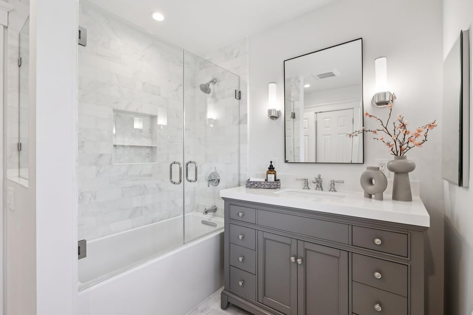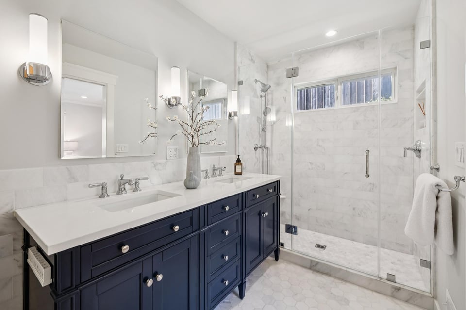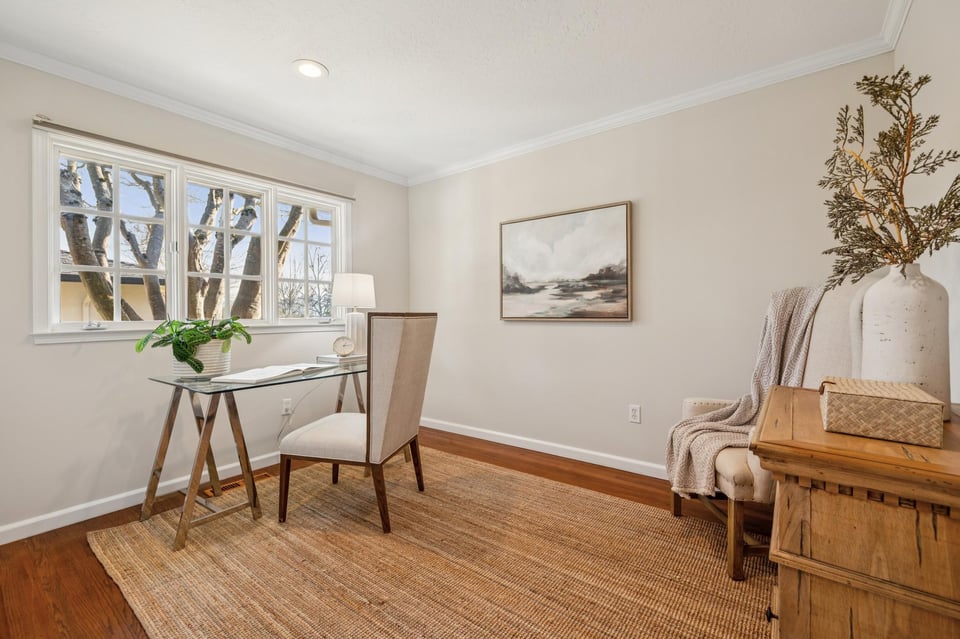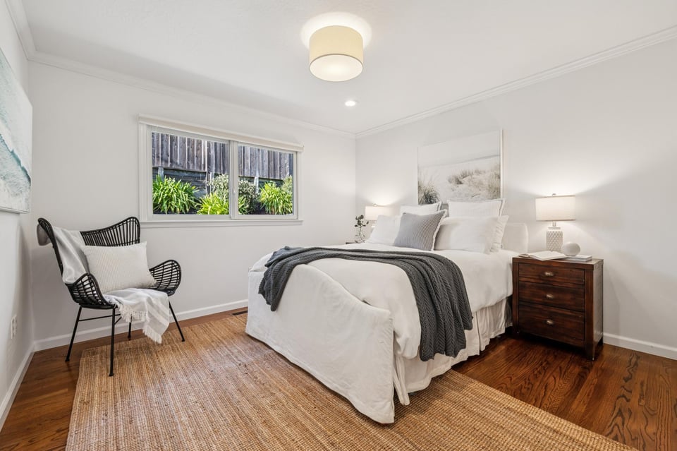 Privately situated to the left of the entry, the bedroom wing offers three well-appointed secondary bedrooms, a beautifully redesigned hall bath, and a serene primary suite featuring an updated bathroom with an expanded walk-in shower.