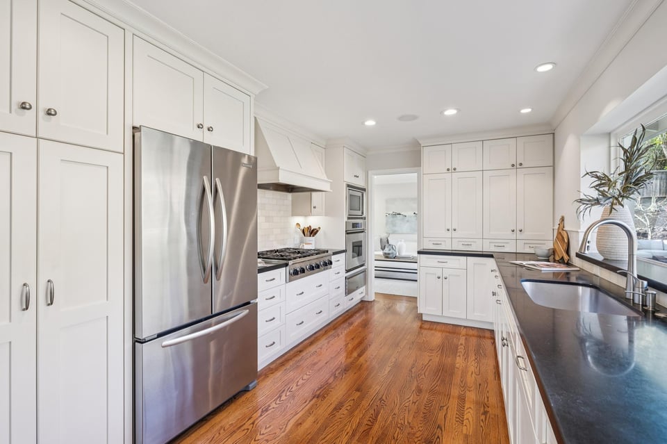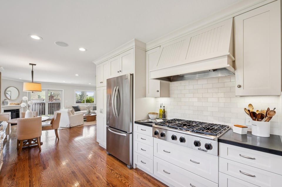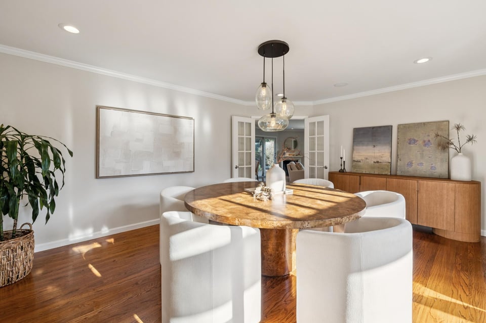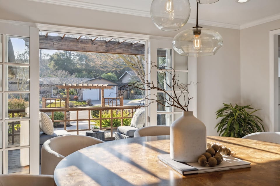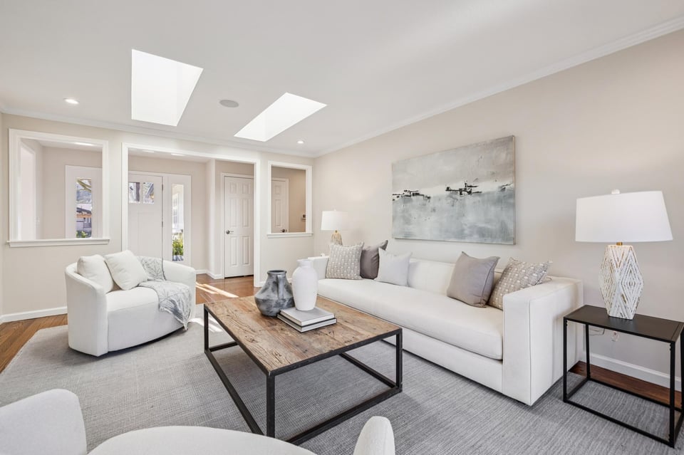 The formal entry leads to a light-filled living room enhanced by skylights and an Andersen sliding glass door that opens directly to the backyard. The formal dining room is ideal for entertaining, featuring a grid-style French door flanked by windows that extend the space to the charming front porch.