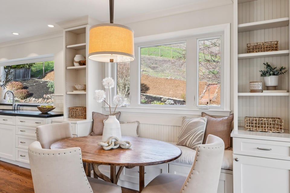 The gourmet eat-in kitchen is both beautiful and highly functional, highlighted by a generous picture window overlooking the backyard and open space beyond. Custom cabinetry, honed granite countertops, a marble tile backsplash, and Dacor stainless steel appliances including a six-burner gas rangetop, oven, and warming drawer anchor the space. An informal dining area with a built-in storage bench flows effortlessly into the spacious great room with a gas fireplace and captivating hill views. Two sets of glass doors opening to the yard further enhance the home’s signature indoor-outdoor lifestyle.