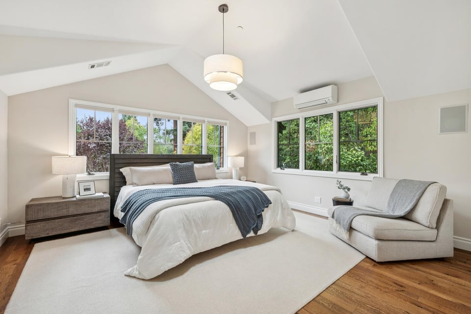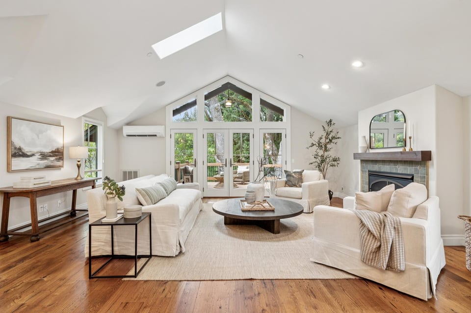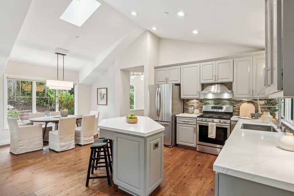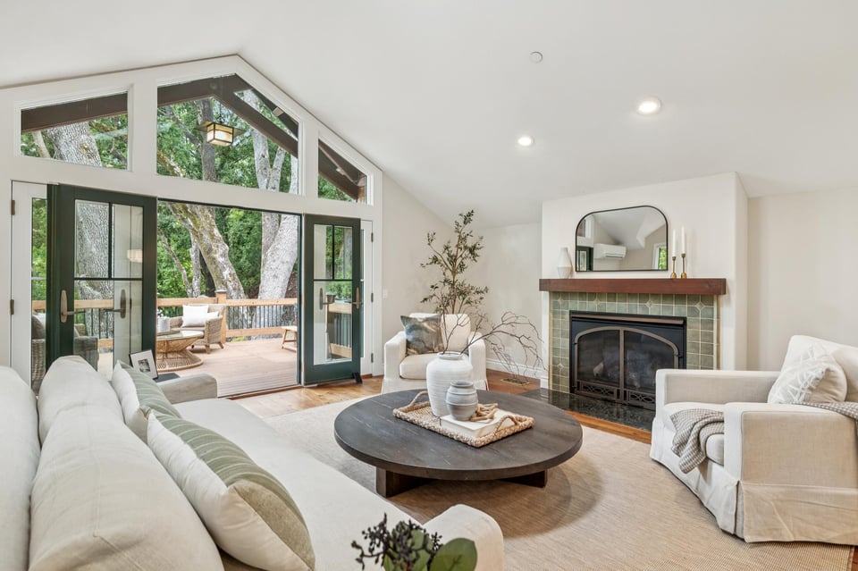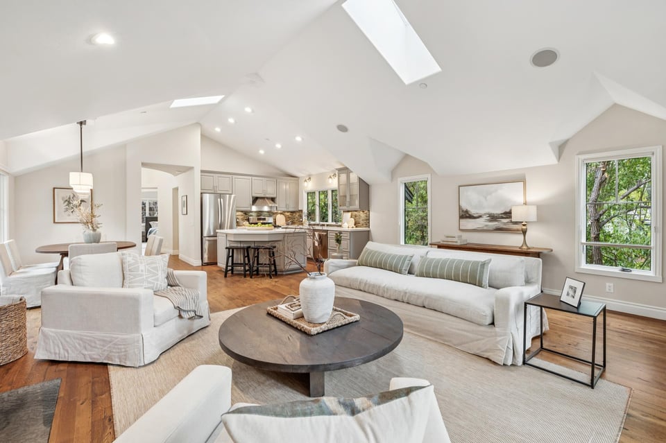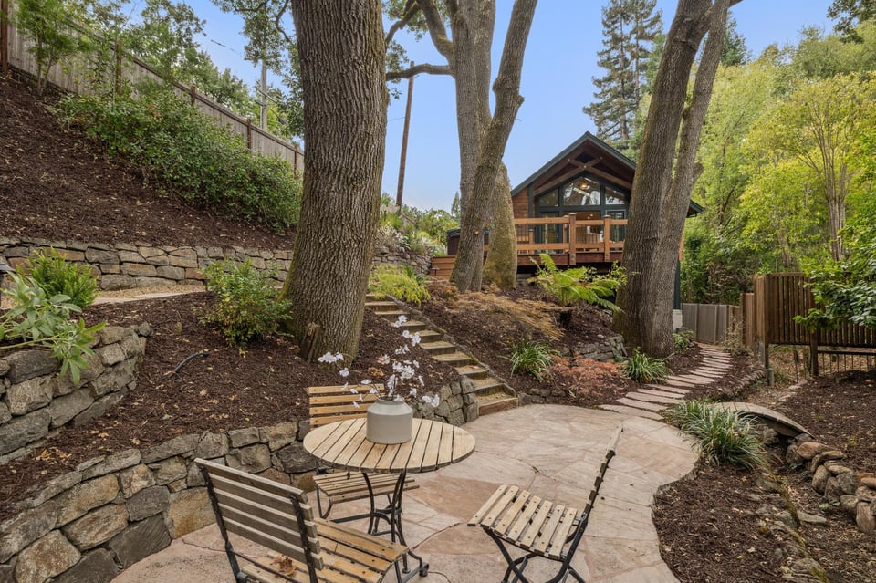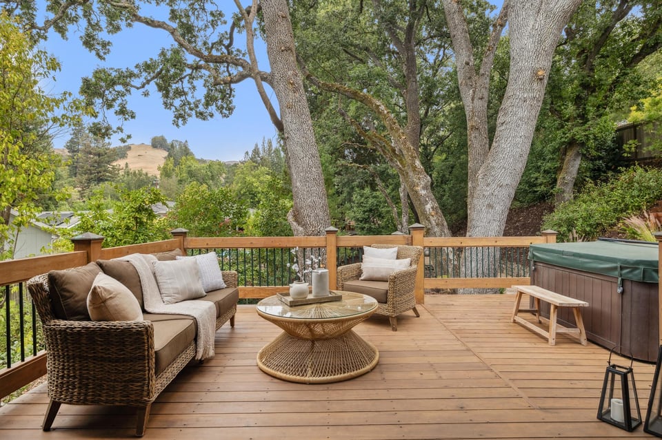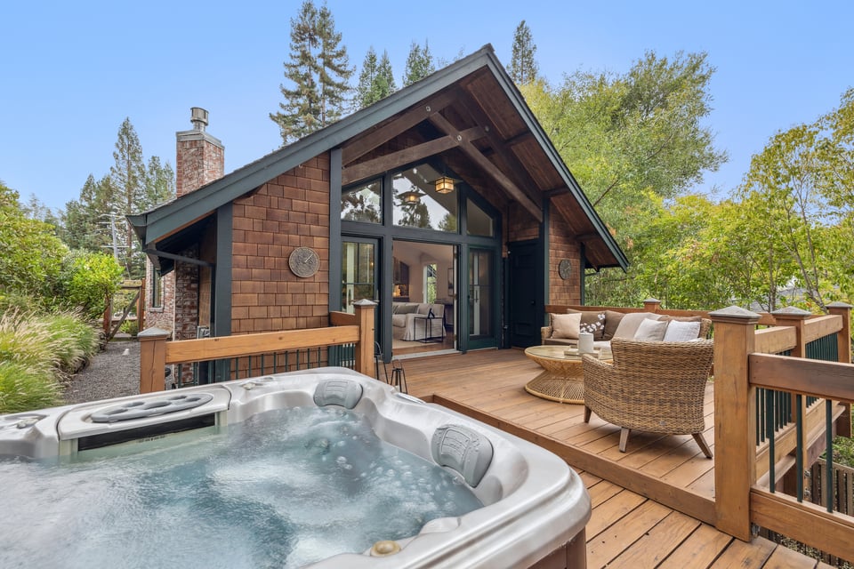 Step inside to discover a private paradise. The chef’s kitchen with stainless steel appliances and an island with seating opens to a dining area and a dramatic great room featuring vaulted ceilings, a skylight, and a stunning wall of windows with French doors leading to a private redwood deck complete with seating and a hot tub.