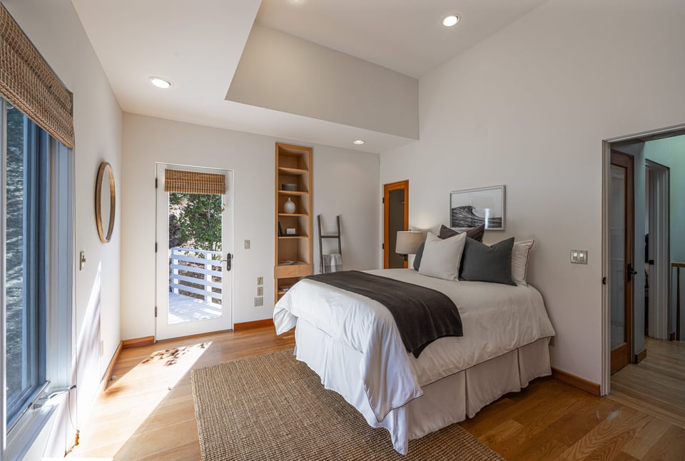 Retreat to a luxurious primary suite featuring a private entry, wood-burning fireplace, and French door out to small patio. Three additional bedrooms including an en-suite bedroom, secondary bathroom and laundry room complete this wing.
