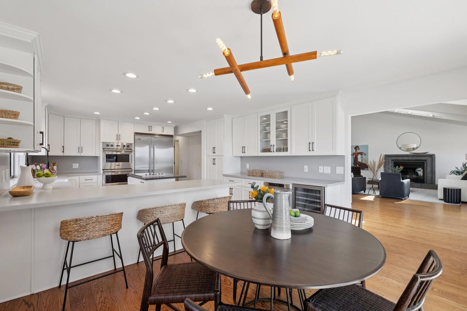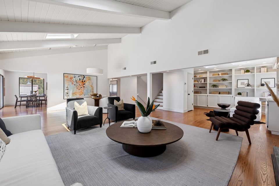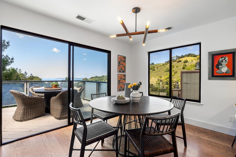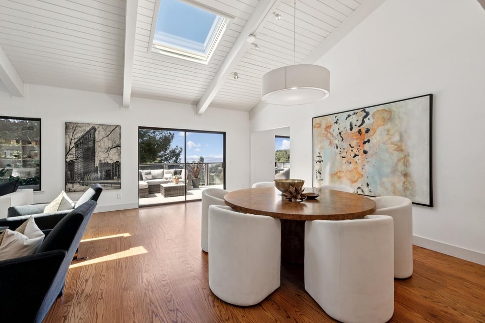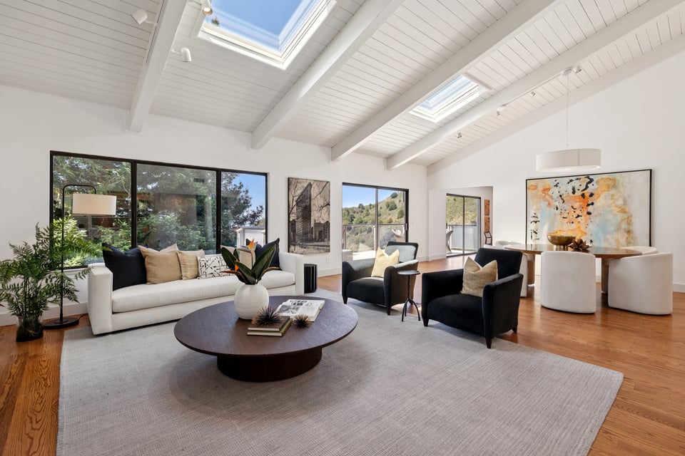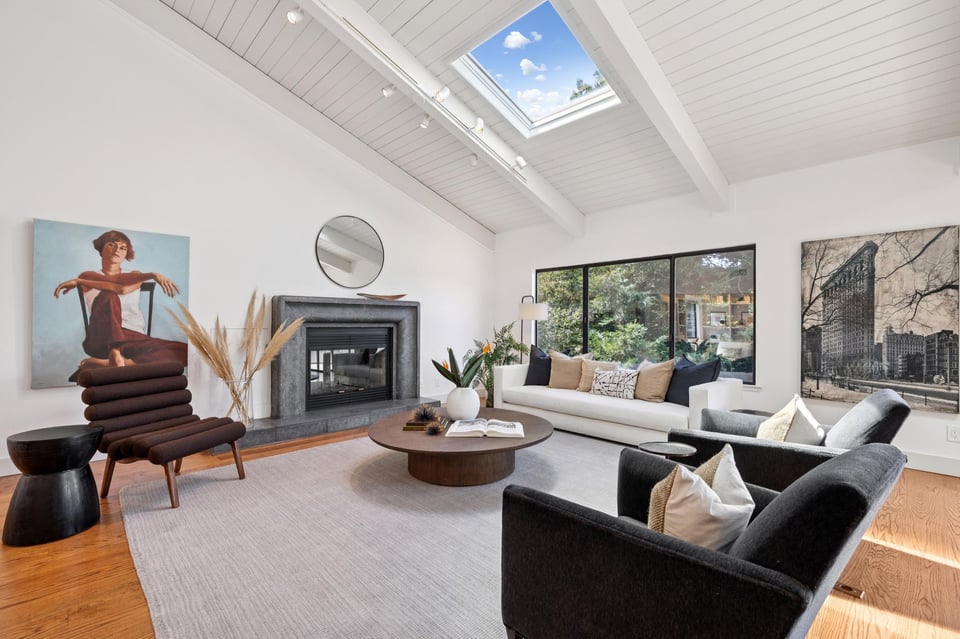 Expansive windows and sliding glass doors frame sweeping Golden Gate Bridge and canyon views from both living levels, creating an ever-changing backdrop of light and landscape. The dramatic living room features a vaulted wood-slat ceiling, a striking stone fireplace, and a seamless connection to the formal dining area. A sliding glass door extends the spaces to a generous deck, perfect for entertaining or quiet moments taking in the iconic vistas. Just beyond, a charming alcove with custom built-ins and additional skylights offers a serene retreat.